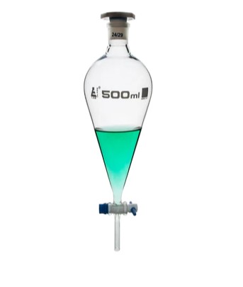 —Разделительная воронка - Squibb, cap. 500 мл, размер патрубка 24/29, боросиликатное стекло, со сменной пластиковой пробкой и запорным краном из ПТФЭ, без градации
