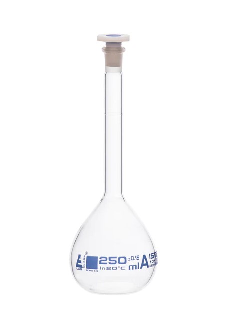 Flask Volumetric class 'A', cap. 250 ml, socket size 14/23, borosilicate glass, Blue Printing