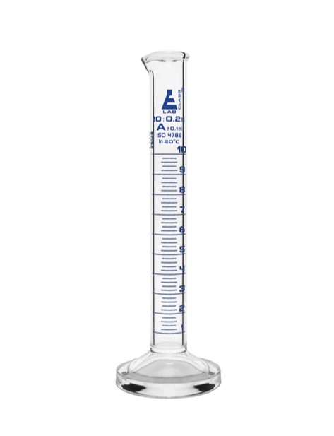 Cylinder Measuring Graduated, cap. 10 ml, class 'A', round base with spout, borosilicate glass, Blue Graduation