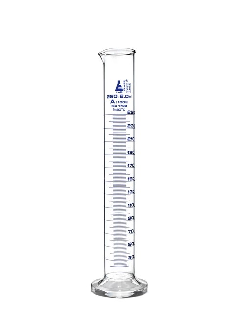 Cylinder Measuring Graduated, cap. 250 ml, class 'A', round base with spout, borosilicate glass, Blue Graduation