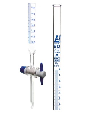 —Бюретки со сменным запорным краном из ПТФЭ с прямым отверстием, вместимостью 50 мл, доп. Div. 0,10 мл Допуск ± 0,05 мл, класс 'A', градация синего цвета